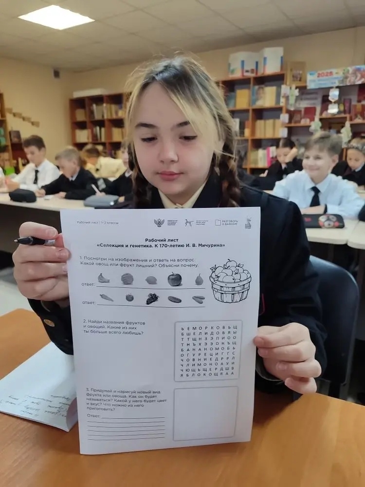 Работы выдающегося ученого и селекционера Ивана Владимировича Мичурина оказали огромное влияние на развитие сельского хозяйства в стране. Ребята узнали о его новаторских методах селекции, таких как отдаленная гибридизация, и о его вкладе в создание новых сортов плодово-ягодных культур, адаптированных к российскому климату.В ходе занятия школьники обсудили основные принципы генетики и селекции, а также их практическое применение в современном мире.